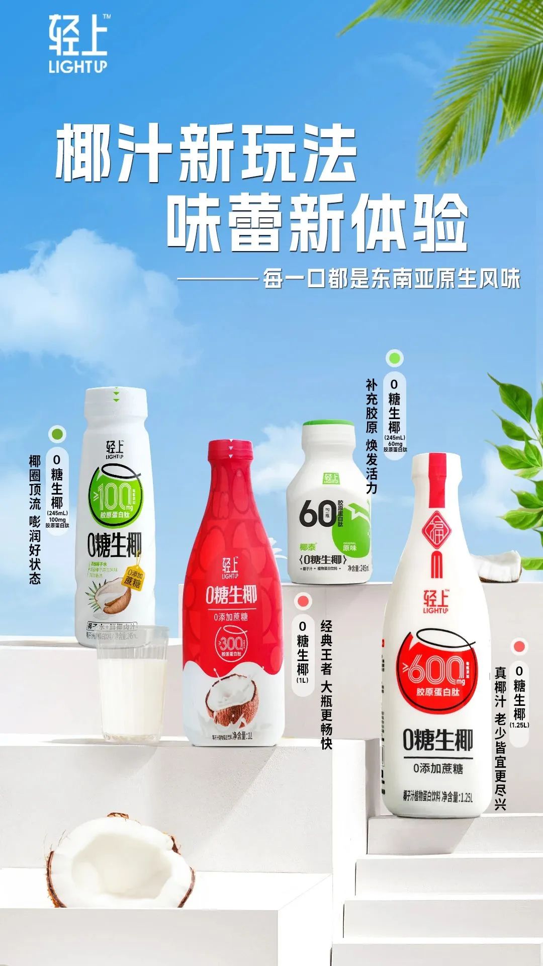 既要健康、要0糖,又要好喝、要營養,面對更多元化的消費需求,椰泰椰汁全新推出輕上0糖生椰。據悉,新品精選東南亞進口陽光鮮椰生榨,主打“0添加蔗糖”,添加膠原蛋白肽,好喝無負擔。在容量設計上,0糖生椰有245ml、1L和1.25L多種規格,增加了在多種飲用場景的便利性和社交屬性。