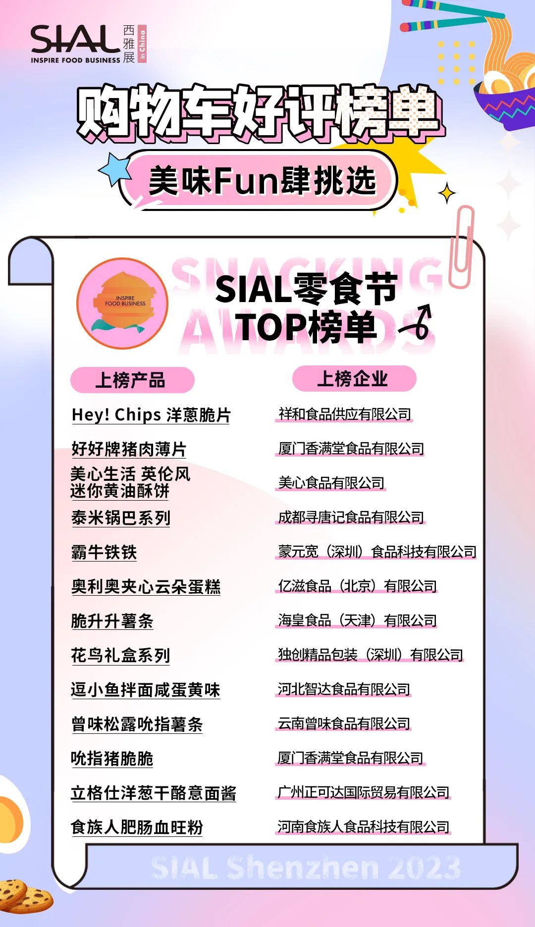 本次活動共計60+產品榮膺SIAL零食節TOP榜單。上榜產品,均由C端消費者、B端專業用戶、頭部KOL、主辦方從“顏值包裝”“口味好評”“時下熱度”“健康低卡”“方便快捷”“創意獵奇”等多維度測評而出。