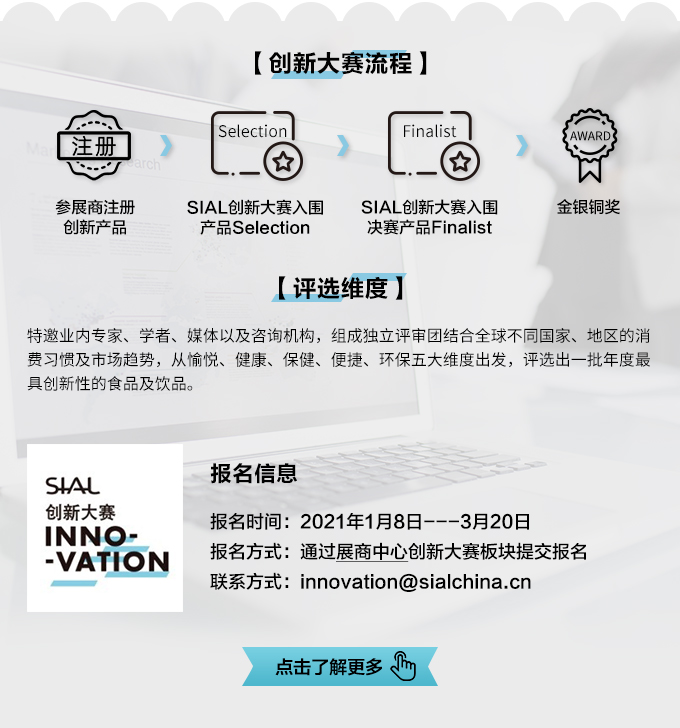 | ◎ SIAL China 2021所有參展商均可參與SIAL 創(chuàng)新大賽,可提交一個(gè)或多個(gè)參展產(chǎn)品。 ◎ 參賽產(chǎn)品需是2020年9月以后研發(fā)或發(fā)布的新產(chǎn)品。